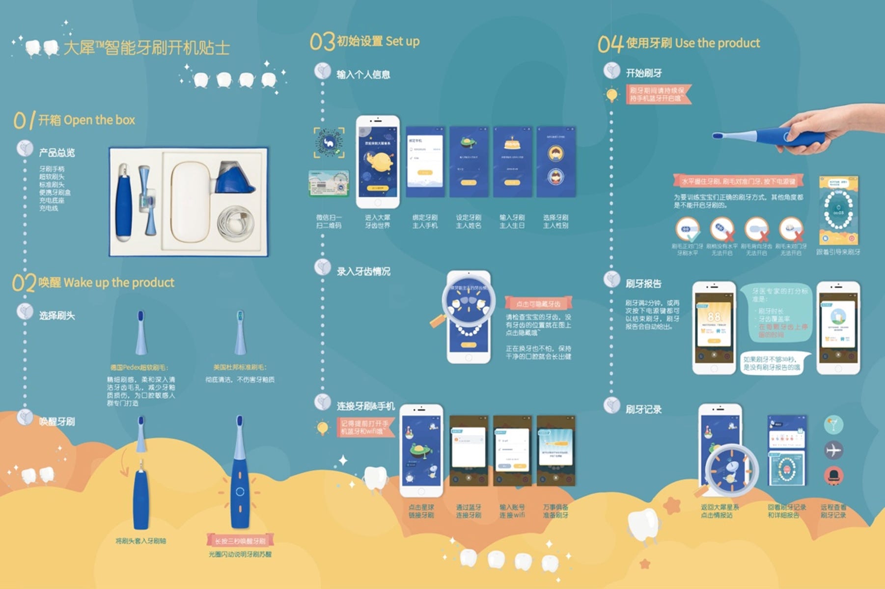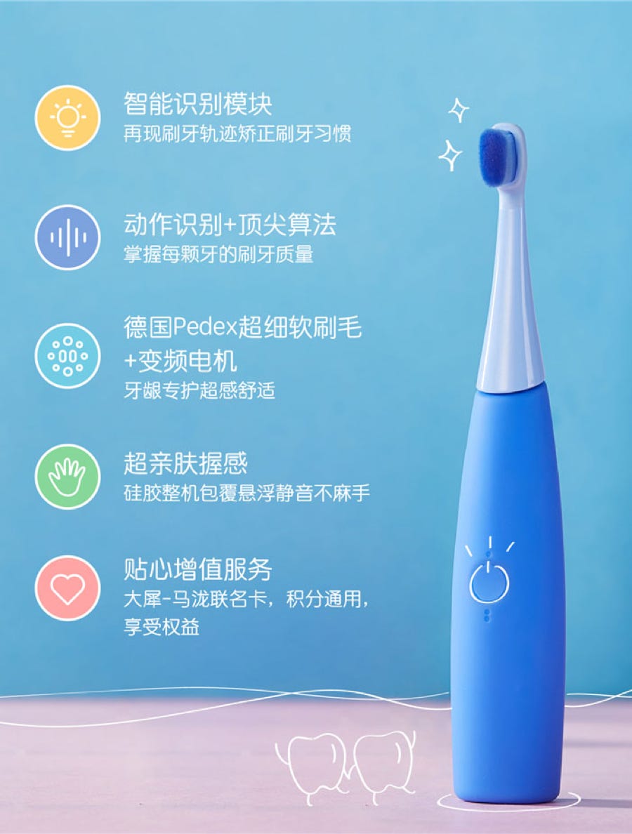 除了智能牙刷,产品还包括亲子牙刷,成人牙刷,智能秤,洗脸刷,额温计等与关爱儿童成长健康息息相关的大健康产品。