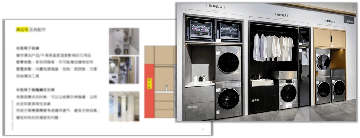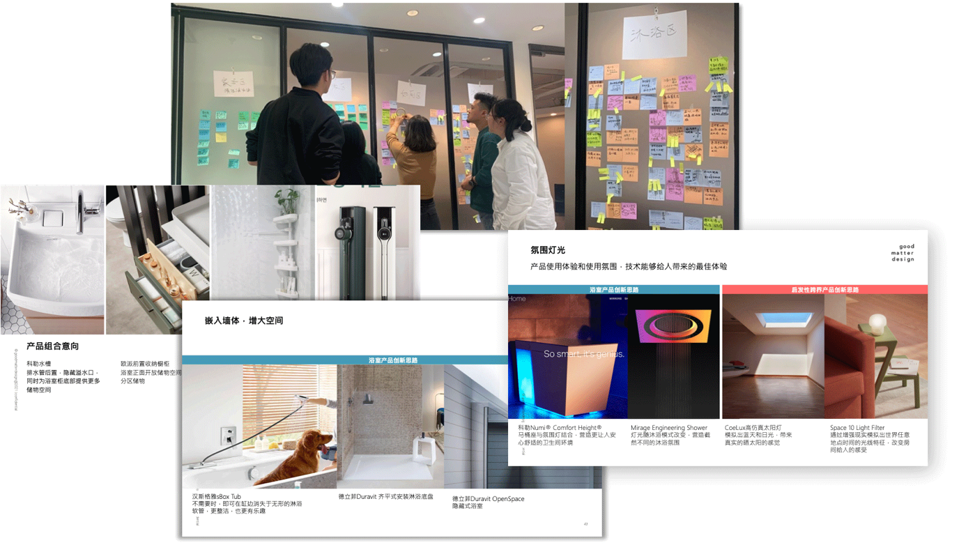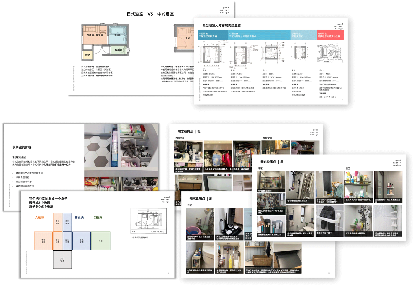 在该项目中,goodmatter针对中国人复杂的卫浴空间结构,将空间解构为顶墙地6面,划分4大区域,探索中国卫浴和日本卫浴在收纳、环境治理上本质差异,并根据市场热点,为松下找到6大场景进行创新突破。