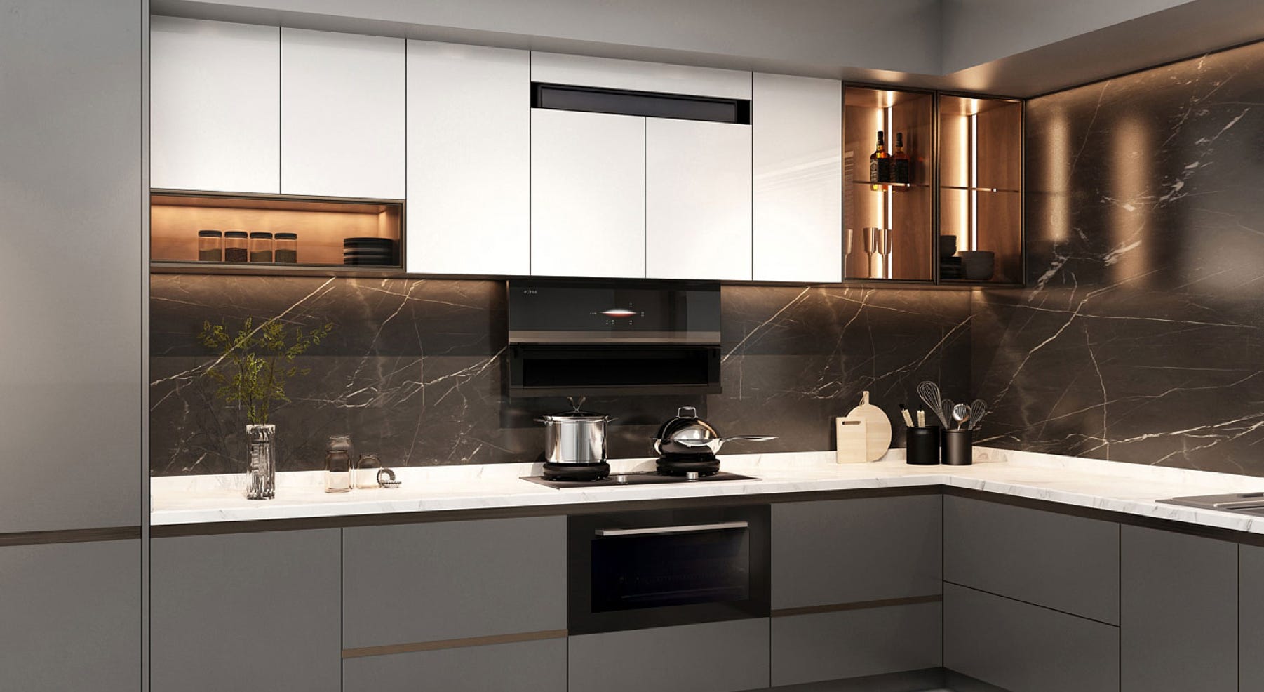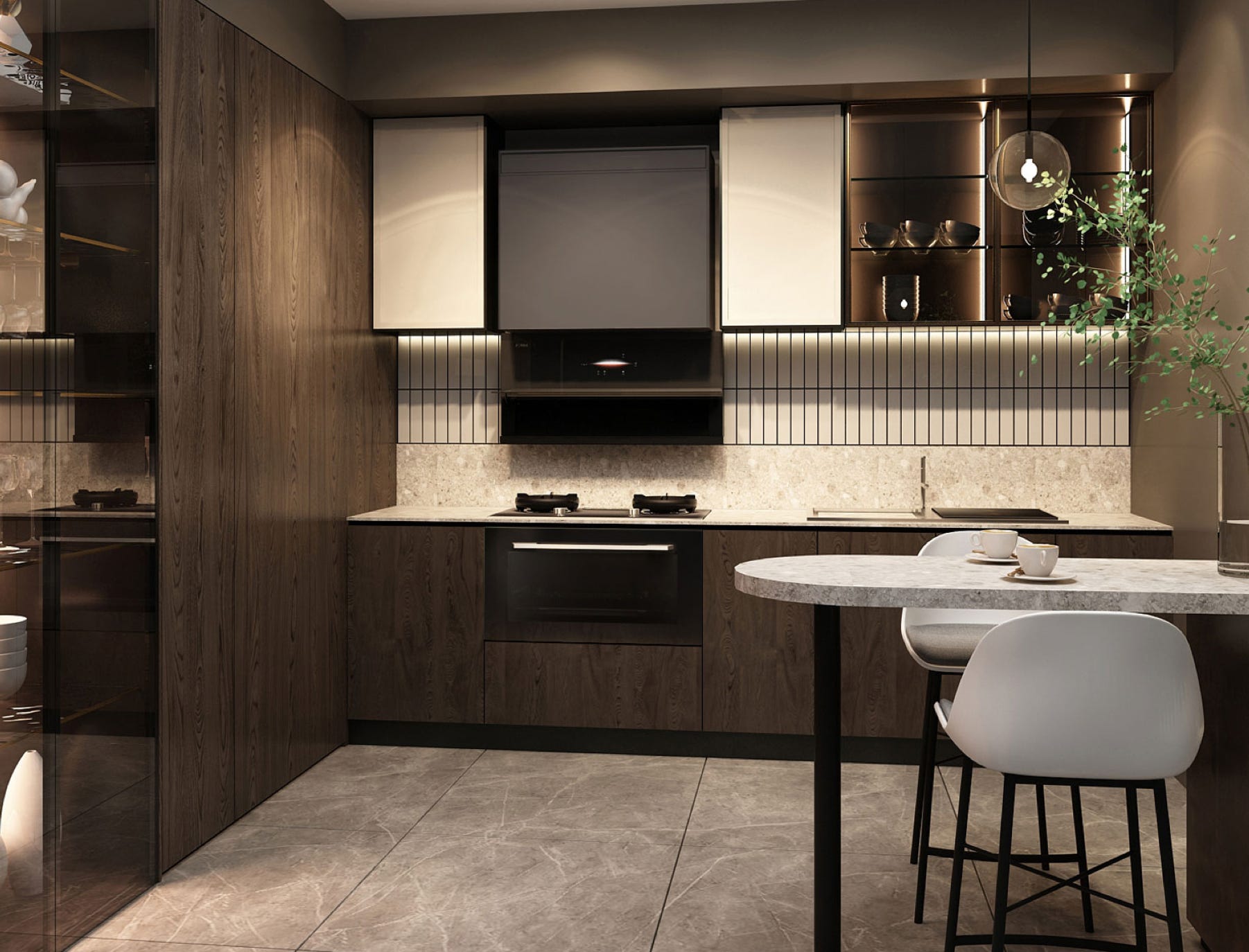 采用黑色玻璃搭配晶钻紫装饰罩的CMF设计,为厨房融入深邃高冷的气质与漫射光泽的韵味,尽显清凉华丽。